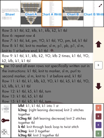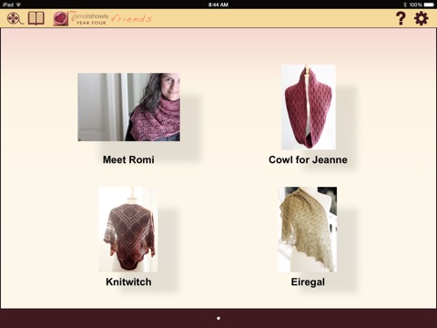 This groundbreaking app is a pattern e-book you can actually knit from! The patterns in this app are all of Romis Seven Small Shawls, Year 4 Friends. It includes: