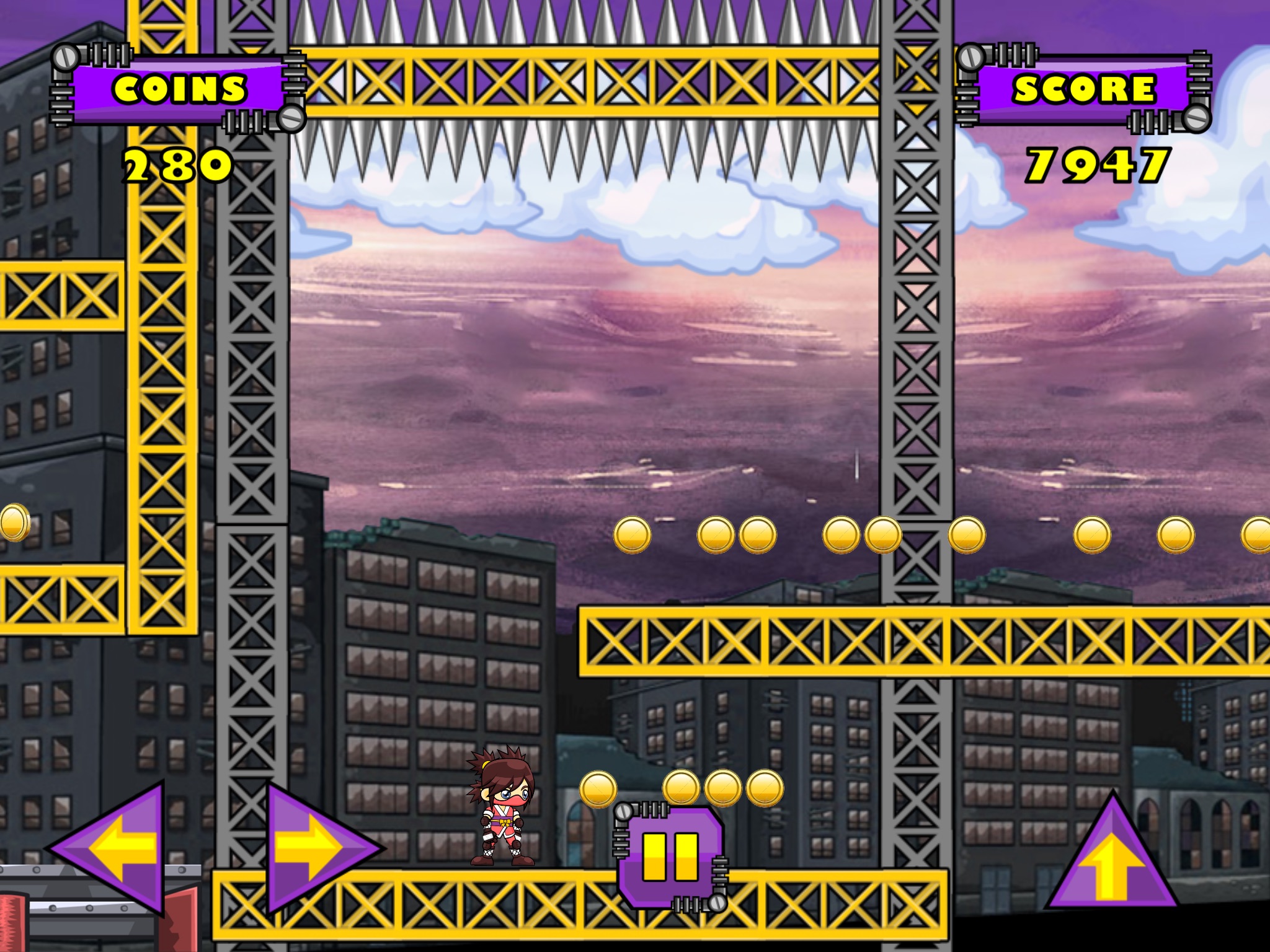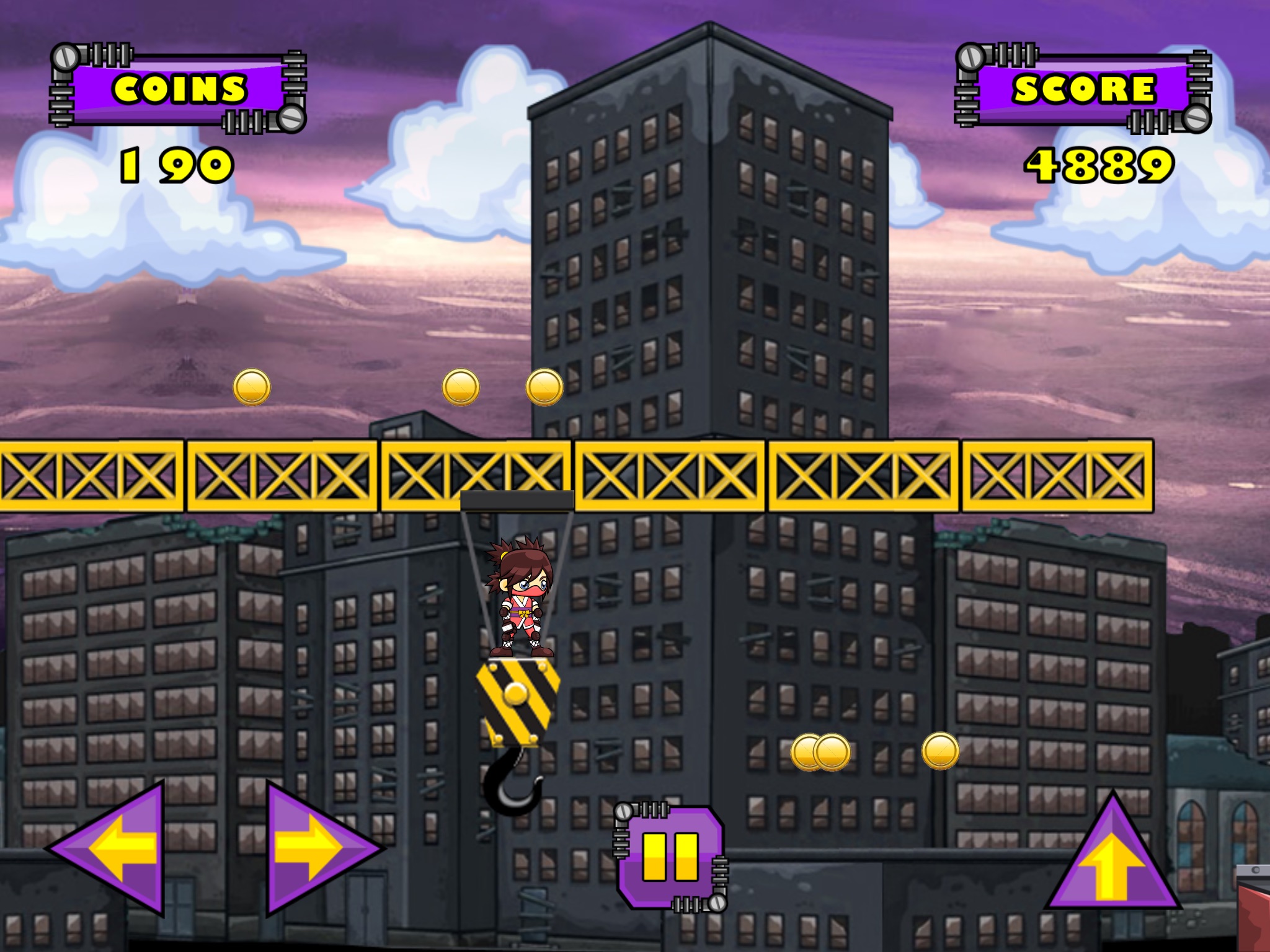You are a no-nonsense ninja, trained to perfection, you have speed, agility, stamina, and above all courage. You start on the roof of the crazed city, already you are confronted with large obstacles to overcome, you are on a mission to scale as many buildings, rooftops, and high rise automated systems, to collect as many coins as possible, each coin gets you 10 points and when you finally complete the game you are given a huge bonus of 1000 coins, you must accomplish this as quickly as possible, time is against you