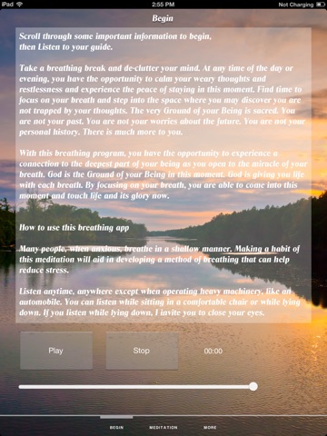 Introduction and Guided Breathing Meditation are presented with options of soothing voice alone and with voice and calming music.