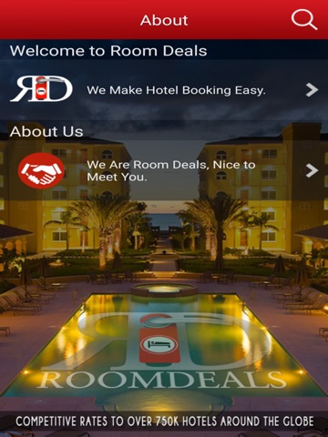 Room Deals mobile app gives you exclusive access to wholesale room rates not available to the general public to over 750K hotel destinations around the world. Unlike our popular competitors, what you see is what you pay! Prices shown on Room Deals always include tax and are for the entire stay of your trip. (resort fees may apply at various resort locations and are due at the hotel when you arrive).