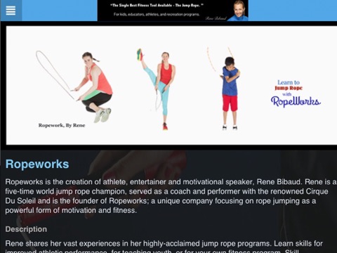 Learn to Jump Rope with the Pros at Ropeworks. Jump rope videos and program information to help you master this lifetime fitness activity. Ropeworks is the creation of athlete, entertainer, educator and motivational speaker, Rene Bibaud.