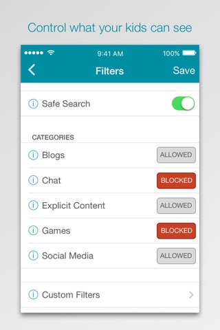 Control what your kids can access online by selecting from preset filter categories or creating your own custom filter lists.