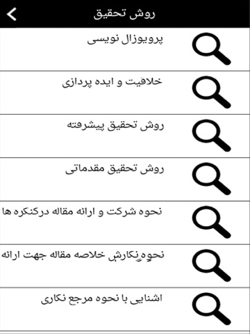 این اپلیکیشن شامل قسمتهایی چون: پروپوزال نویسی - روش تحقیق پیشرفته - خلاقیت و ایده پردازی و ...