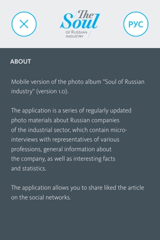 The application represents a series of regularly updated photo-essays on the best Russian industrial companies.