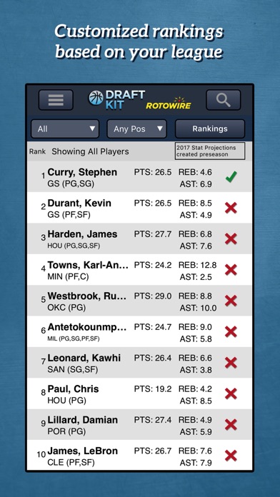 Simply enter your leagues scoring and roster settings and the app creates rankings from a value-based calculation that uses RotoWires 2017 stat projections. Here are few of the features: