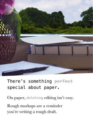 Ever write your first draft on a notepad? Writing on paper, you let go and just get your idea out. You dont get caught up perfecting the words too early. Rough Draft is like writing with pen and paper, so you cant delete words, only cross them out. Each "edit" reminds you that youre writing a rough draft.