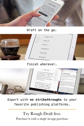 • Clean Export - When youre done drafting, Rough Draft can remove your scratched-out words, and export a clean ready to revise draft.