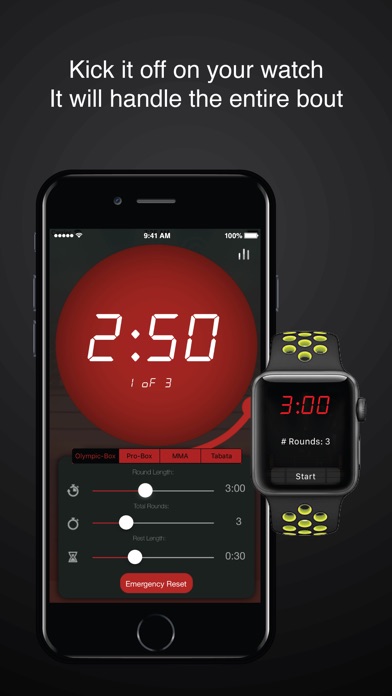You set it off with your Apple Watch and it will handle the entire bout including rest length in between rounds while training, making the iphone ring to notify a round ending and starting.