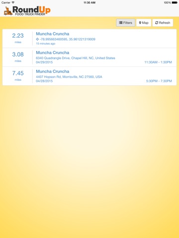 The premier food truck finding app is here. Starting in Raleigh, NC and looking to sweep the nation. RoundUp is your #1 source for food truck locations and local food truck rodeos.
