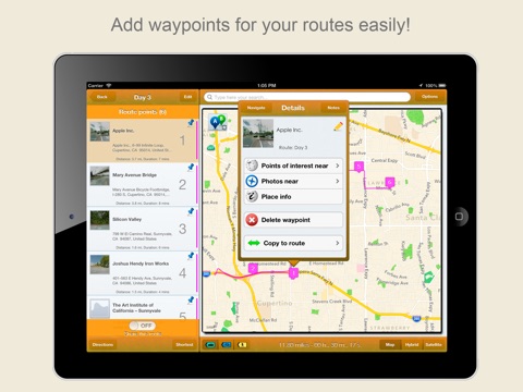 - Add up to 25!! waypoints for each route by simply tapping the map. Incredibly easy!