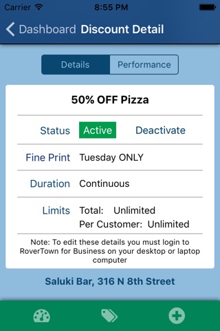 RoverTown for Business is your mobile marketing toolkit for quickly attracting more student customers. You can log into your RoverTown for Business account from any computer or mobile device to create discounts, view analytics, reward loyal followers, get featured in email blasts and more.