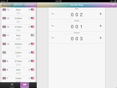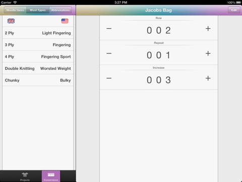 Row Counter can also help you translate wool types from UK to US and also comes with a frequently updated list of common knitting abbreviations.