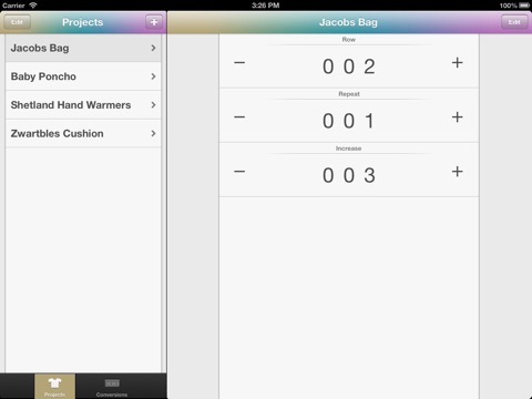 Row Counter makes it easy for you to manage all of you knitting projects. Each project comes with three default counters, but you can create as many custom counters as you need. Each counter is gesture enabled, swipe from left to right to increase, from right to left to decrease and double tap the numbers to reset, or you can use the buttons if you wish.
