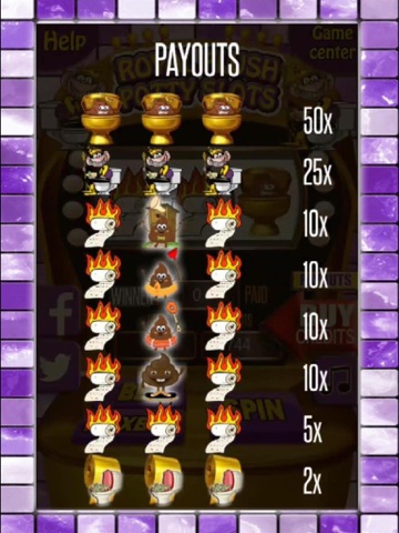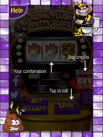 To share Royal Flush Potty Slots and invite your friends on Facebook and Twitter to play, simply tap the purple Facebook and Twitter buttons to the left of the giant gold toilet.