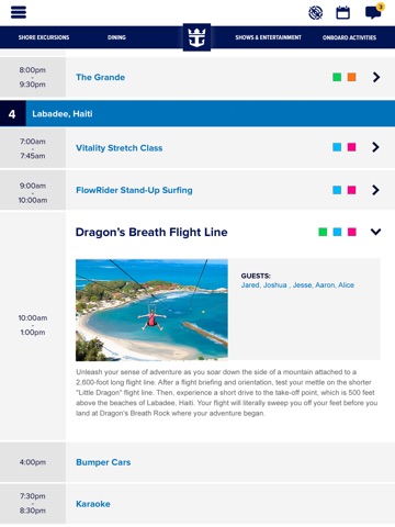 Download this app to use on a recent voyage on the Anthem of the Seas. Though useful to view the personal calendar and also view statement of purchases, it did not record reservation made on board ship, which was a complaint that many on board had. So we missed many activities that we thought we reserved, which by the way the app displayed confirmations of. The app really was not useful as the interactive television in our room was more useful. If you want to have a handy calendar of your activities on board at your finger tips, then this app is useful, otherwise dont waste your time. Can be very good if the on board integration if fixed.
