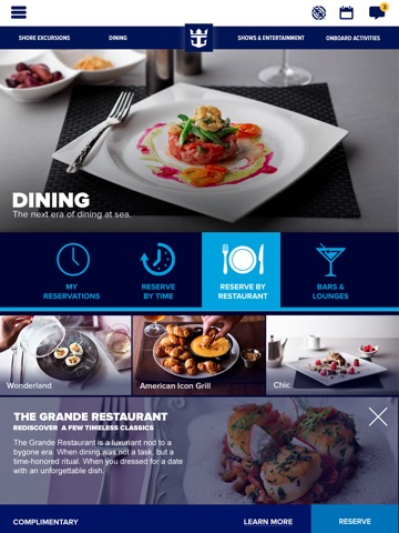 Its a step in the right direction, and very welcomed, but a lot of room for improvement. Eg they need a section where all the restaurant menus are in one place and you can easily scroll between them. Also they dont update some parts regularly enough - eg out of date menus. Good for booking excursions. I found I had to keep a paper copy of the daily ship activities - really it should be all on the app. Would be if to add a feature to wait list for excursions if the one you want is sold out - some people always drop out. Calendar feature should alert you when your tour is about to depart. Recommendation to RC- spend a few days with actual passengers on board to see how they really want to use the app.