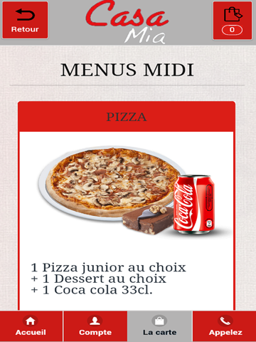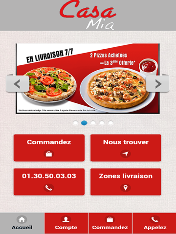 Lapplication Iphone/Ipad de Casa Mia vous permet de commander en ligne ou par téléphone via votre application . Vous pouvez consulter notre carte et choisir vos produits .