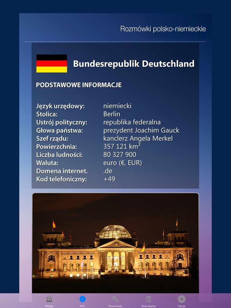 Aplikacja posiada spory zbiór zwrotów przydatnych na codzień. Zebrane są one w tematy, typu liczebniki, podróż, zdrowie. Z cała pewnością przebywając w Niemczech, czy innym kraju gdzie obowiązuje niemiecki program nie raz się przyda. Niestety nie ma możliwości odsłuchania pojedynczych wyrazów, a tylko całego tematu. Co prawda nagrania mają nie więcej jak 5 minut, ale i tak czasami trudno znaleźć szukane słowo. Dodatkowo doskwiera nieszczególnie duża ilość owych słów. Za 1,59€ nie można oczekiwać cudów, ale najtańsze słowniki nie są już dużo droższe, a mają zazwyczaj o wiele większe bazy. Ponadto w programie mamy podstawy gramatyki niemieckiej. To plus, jednak, na mój gust, przedstawiona jest ona w mało czytelnej formie. Może jest to spowodowane moją nienajlepszą znajomością tego języka, ale chyba właśnie dla takich osób powstała ta aplikacja. W każdym razie, z cała pewnością niemieckiego się z niej nie nauczymy. Podsumowując program jest dosyć sympatyczny, szczególnie teraz, gdy cena wynosi 0,79€. Nie da się jednak ukryć, że chociaż przyda się w wielu sytuacjach, to znajomości języka nie zastąpi.