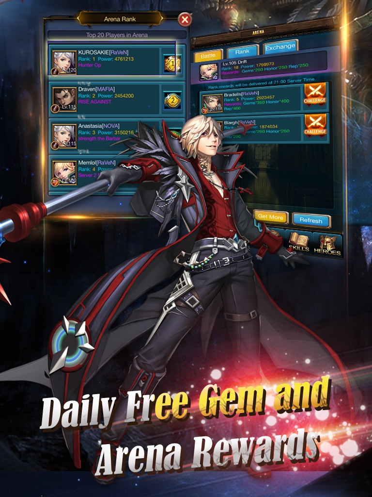 You may show off your strength by defeating other players in the Arena. Defeat higher-ranked players to switch place with them and earn periodically distributed gems. Fight your way onto top 20 for the immortal leaderboard!