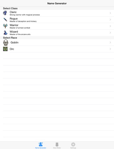 Have you ever had difficulty naming a NPC in a role playing game? This app solves the NPC naming problem by providing a random name generator based on character class. So if you are in a bind and need to come up with a great name for that NPC fighter or wizard then this app will be your best friend.