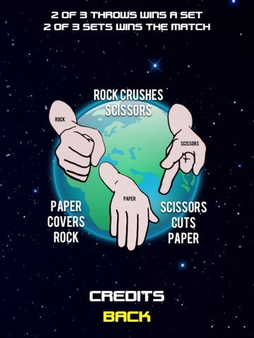 Each match is in the "best of 3 of 3" format. Win 2 out of 3 throws (e.g. rock wins against scissors) to win a set (like in tennis). Win 2 out of 3 sets to win the match.
