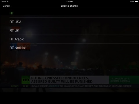 RT news LIVE on your mobile devices in English, Spanish and Arabic! Live 24/7! Watch RT news LIVE in English and Arabic! This app delivers live feeds of RT America, RT UK, RT Global, RT Arabic and RT Spanish to your iOS device. RT is a 24/7 news channel broadcasting over six continents and in over 100 countries. We are here to bring you another story.