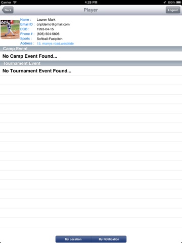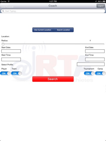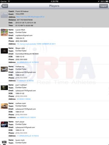 RealtimeAthletes recruiting for softball players. Collegecoach can search for players with different search parameters in realtime basis using GPS location, date, time and other player criteria. Players can set their current location in real-time basis and check into events so that they can be found in search.
