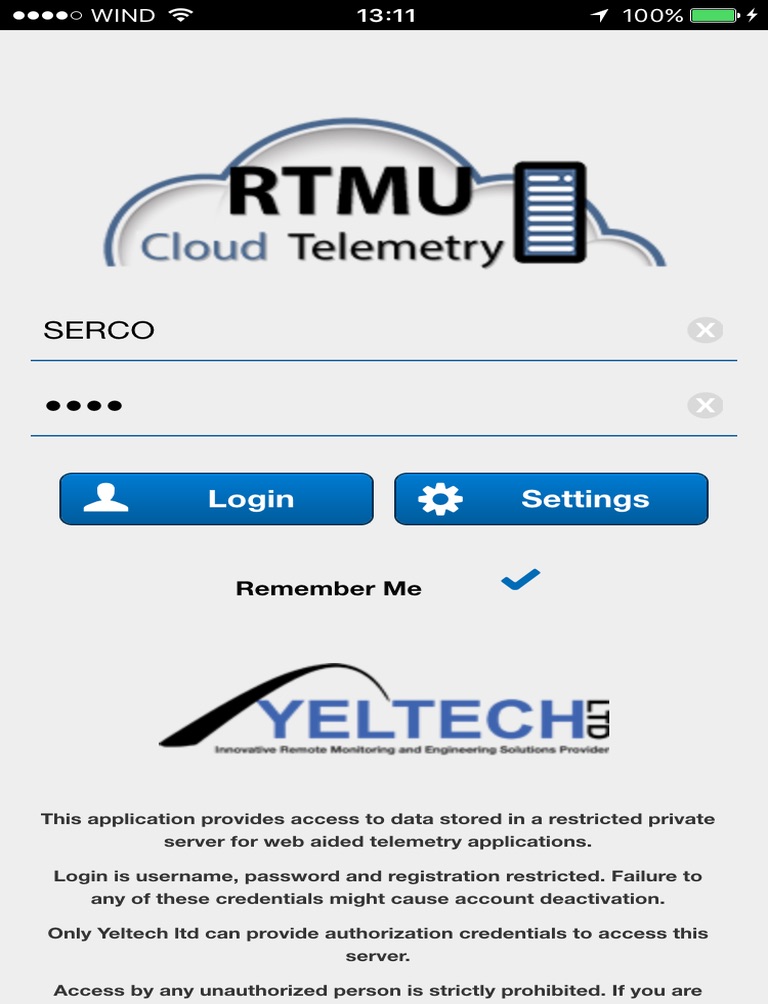 This is a restricted private server for web aided telemetry applications. Login is username and password restricted. Failure to any of these credentials might cause account deactivation. Only Yeltech ltd can provide authorization credentials to access this server. Access by any unauthorized person is strictly prohibited.