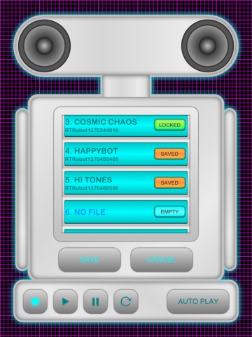 Simply push COMPOSE and RTRobot Free makes a new ringtone. If you wish to store the ringtone save it in an empty memory slot. Select load to access saved ringtones. Pushing the orange saved button will turn the button to green (locked). The ringtone is locked from being deleted (swipe table cell to delete when button is orange only).