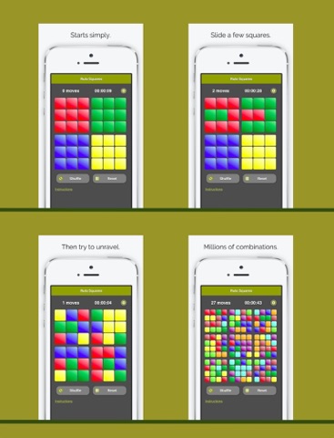 Squares in the puzzle can be slid horizontally or vertically to shuffle them. The aim is to restore the squares into their original single color grids.