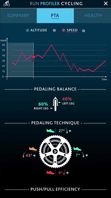 - Customized advice to improve your pedaling angle (4 axes), your pedaling balance, your push/pull efficiency