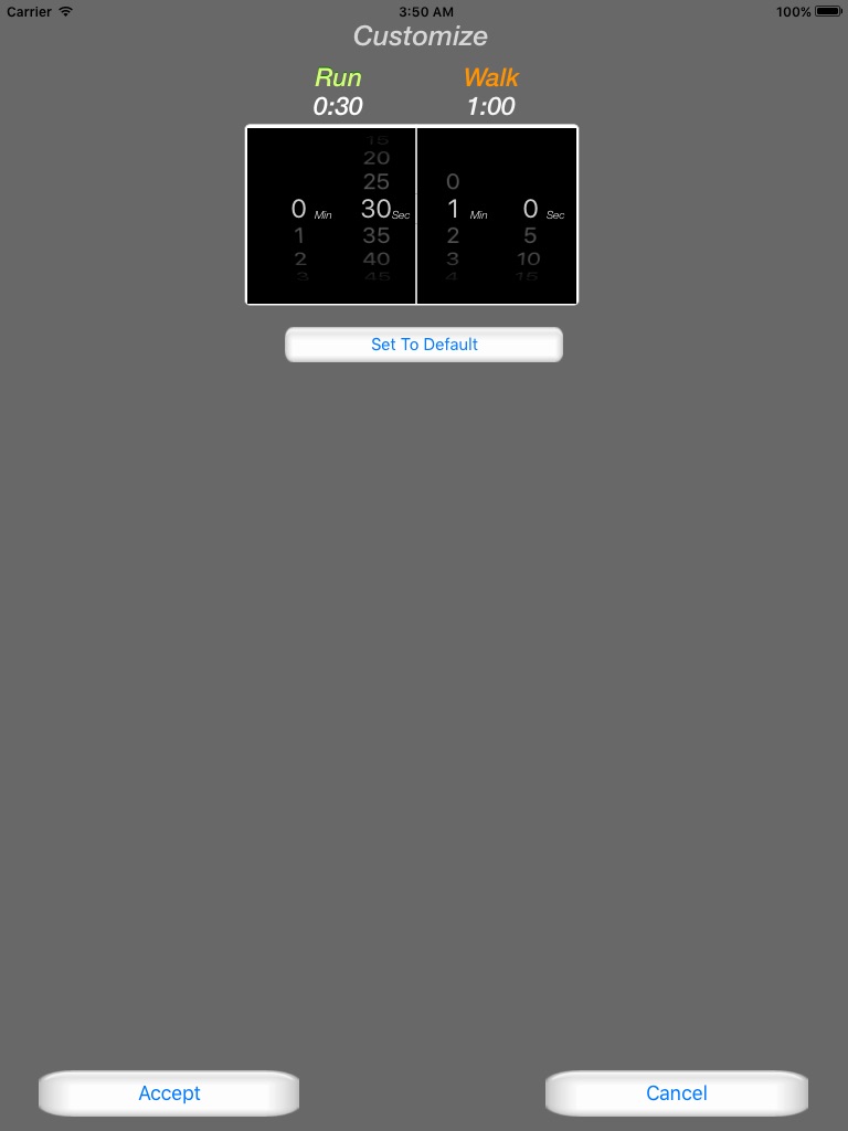 Customization is here! Running Interval Timer Pro allows for customized Run-Walk times for any of the 11 buttons while still keeping the quick easy-to-use style.