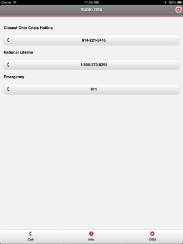 RUOK: OSU displays the number for the 24 hour/365 day suicide prevention crisis lines geographically closest to the callers physical location. At the moment, service is only available for crisis centers in the state of Ohio. This app also provides the national Lifeline number and additional resources and suicide prevention information.
