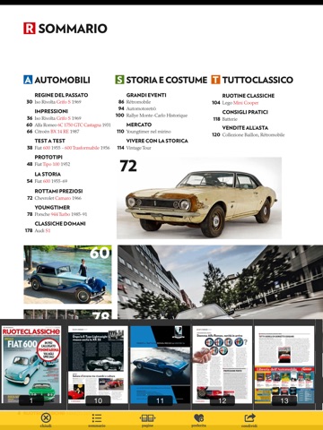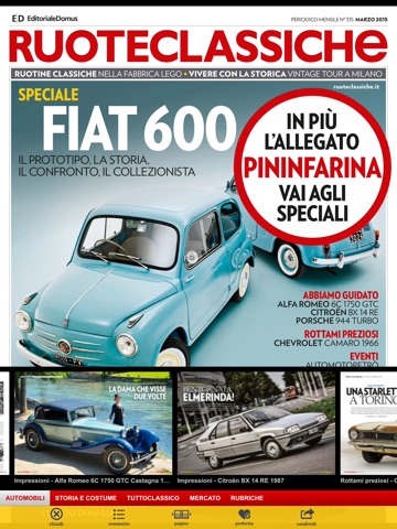 Ruoteclassiche, il mensile di riferimento per chi ama l’auto d’epoca, e i suoi Speciali a tema raccontano la storia, le curiosità e le prestazioni di tutte le classiche, dalle piccole utilitarie alle grandi regine del passato, italiane e straniere. In ogni numero servizi esclusivi con spaccati, fotografie d’epoca, impressioni di guida, informazioni tecniche, interviste e testimonianze. Ampio spazio ai grandi eventi e al mercato, con le quotazioni di tutti i modelli, i prezzi delle aste e gli annunci di vendita e acquisto.