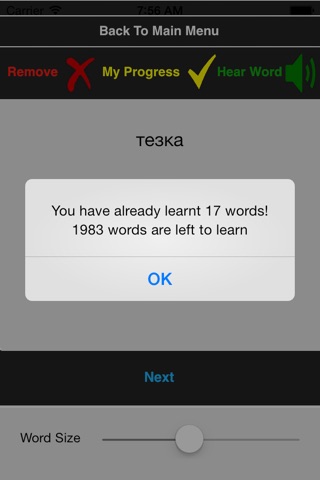You can listen to the correct pronunciation of every word or phrase that the app offers. You will be able to remove the words that you have already learnt or knew, so they will not be displayed again, which will give you more time to work on the words which you have not quite learnt yet. You can always check how many words you have already learnt, how many are left, and test your knowledge to ensure that you are on the right learning track. At any time you will also be able to restore all words that you have removed. All of this will help you to learn the number of words, that is enough to speak a language well, very fast.