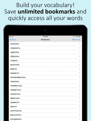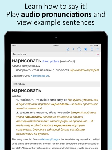 Free offline Russian dictionary and thesaurus plus Russian to English translations. Play audio pronunciations of words, save unlimited bookmarks, and use voice searches.
