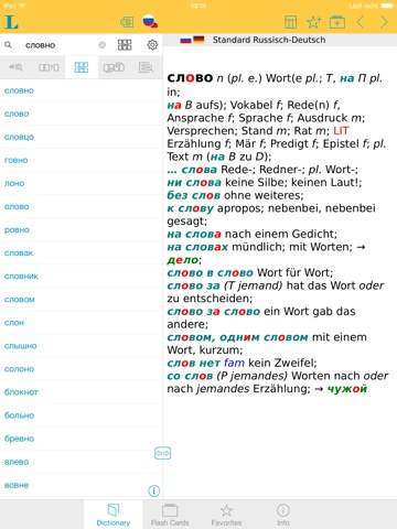 Man kann die Wörter nicht auf Russisch suchen, denn die Buchstaben schalten sich auf Deutsch wieder zurück. Also keine von Deutsch auf Russisch übersetzen möglichkeit. Von Langenscheidt und füf den Preis hätte ich etwas besseres erwartet !