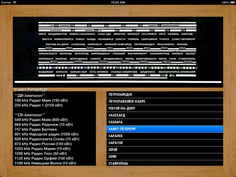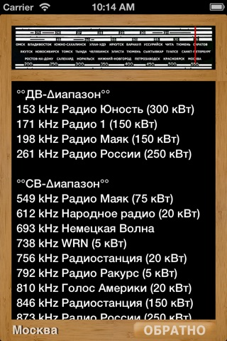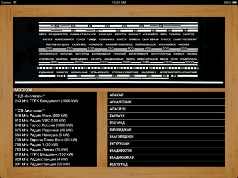 The application containt the current list of names of the Radio Stations which air-casting from the Russian regions, their frequance (kHz), and the Power of Radio transmuter (kW). The last feat is showing how long distance may be from transmitter to receiver. Than more the Power, than long the distance for transmit the waves.