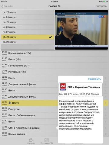 This app is your mobile TV set for live Russian channels from all over the world! Subscribe and watch 90+ channels, most of which come with TV listings. Many channels allow watching recorded shows up to 24 hours after air time. You can also add your own channels! Search for your favorite shows and setup reminders before show begins.