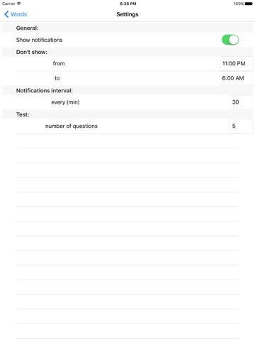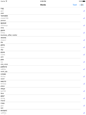 The app will help you to memorize russian words using notification on your device, which are shown after configurable interval. Theres also a test that will allow you to check your knowledge on a configurable number of words. Complete list includes more than a 100 essential russian words with translation and transcription. After you memorized some of the words, you can uncheck them to exclude them from notifications.