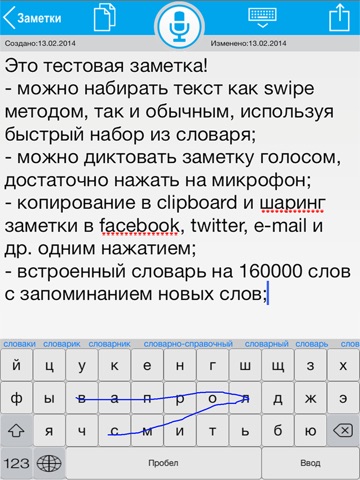 С таким функционалом программа должна быть бесплатным: swipe-набор не работает, настроек нет, как удалять заметки так и не понял. Разработчики, прежде чем брать деньги за такое "приложение", дайте попробовать триальную версию, иначе это просто мошенничество!
