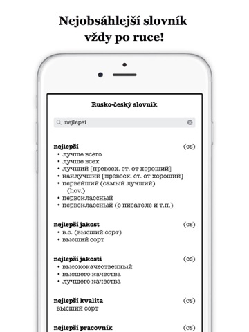 Vyhledávejte v nejrozsáhlejším rusko-českém slovníku dostupném pro mobilní zařízení. Můžete rovnou začít hledat, klidně bez diakritiky a bez výběru směru překladu. K hledání není potřeba internetové připojení, ale i tak slovník obsahuje více než 120 tisíc překladů.
