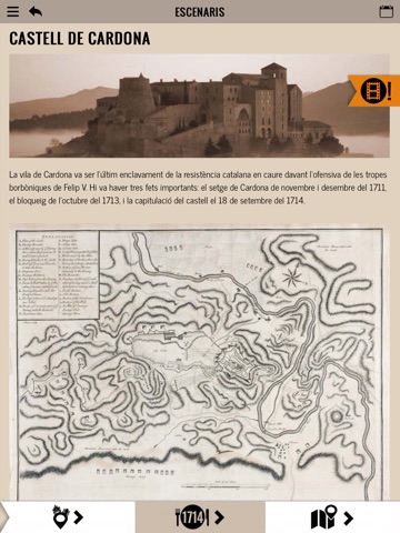 Esta app se publica en el marco de la conmemoración del Tricentenario del desenlace de la Guerra de Sucesión (1714-2014), y la creación de la Ruta 1714, una iniciativa de la Generalitat de Catalunya para poner en valor los escenarios, espacios y villas más destacadas que conforman el testimonio de aquel conflicto. La app te permitirá llevar en el bolsillo toda la información necesaria para ir recorriendo las 55 poblaciones que forman la Ruta 1714.