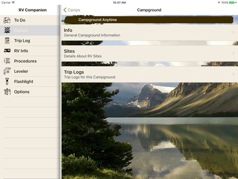 RV Companion makes it simple and fun for Recreational Vehicle and Pop-Up camper enthusiasts to track all of their RV and camping information in one easy-to-use app. The RV Companion application tracks supplies, campground and site information, reservation contact details, RV information, tow vehicle information, maintenance records, procedures (winterizing, starting the water heater, etc.), and trip logs for each campground. Special utility features include a camper leveling mode with yellow bubble levels.