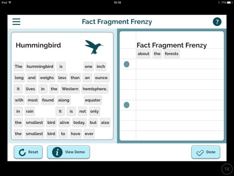 Fact Fragment Frenzy, included in an extended research skills unit which also employs the Hints about Print interactive, aids students in learning the importance of finding the words in sentences and paragraphs that contain the facts they need for compiling their research. They practice by pulling important words from a text over to a virtual notebook. The students then move to putting those notes into their own words, avoiding plagiarism. Having elementary students participate in the fact-finding process early in their school experience promises to enrich further study and enjoyment of nonfiction texts.