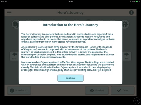 The heros journey is an ancient story pattern that can be found in texts from thousands of years ago or in newly released Hollywood blockbusters. This interactive tool will provide students with background on the heros journey and give them a chance to explore several of the journeys key elements. Students can use the tool to record examples from a heros journey they have read or viewed or to plan out a heros journey of their own.