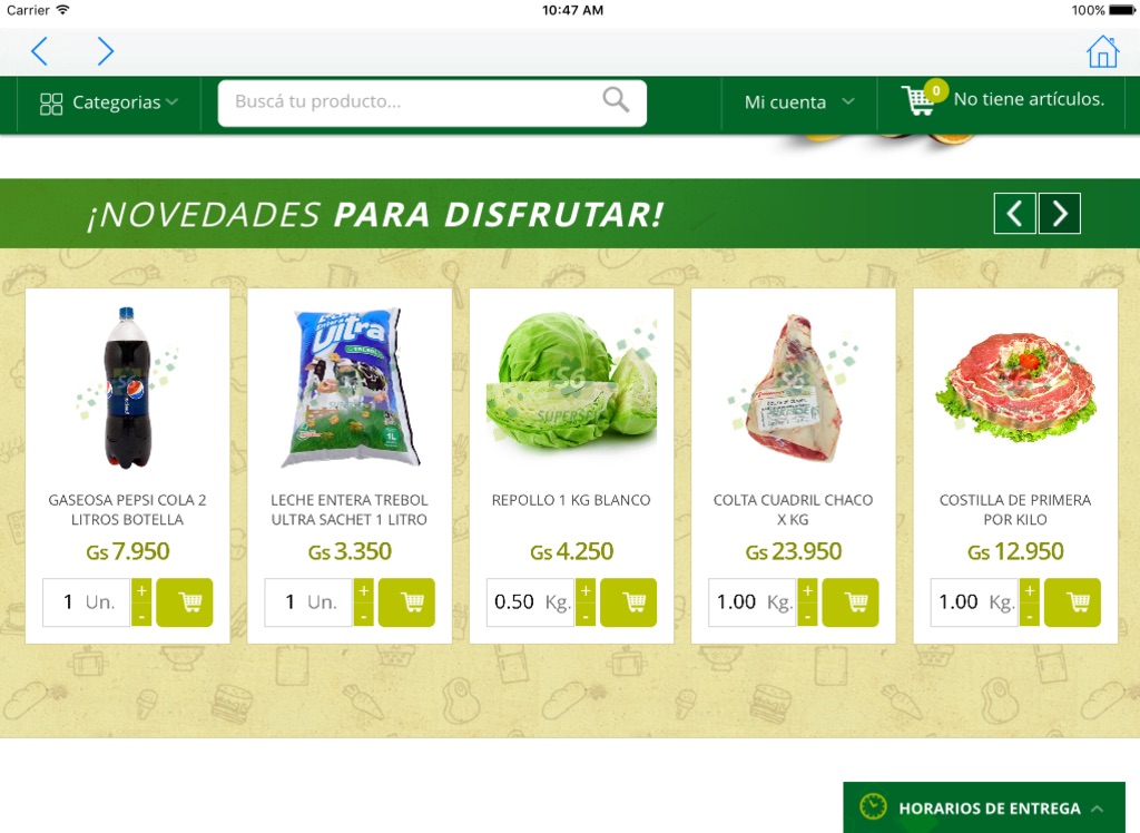 Con Superseis Online de Supermarcados Superseis podes navegar por los distintos sectores del menú en donde están cargados todos nuestros productos con su respectiva imagen, de esta forma sabrás qué es lo que estás comprando. En Superseis Online el método de compra es cargar los productos al carrito como si estuvieses dentro del local, para esto tan solo tendrás que ingresar una cantidad numérica o utilizar el cargador por unidad y el producto será agregado automáticamente a tu carrito de compras.