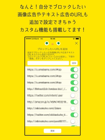 ●1.ひよこ広告ブロックアプリを起動し、ブロックしたい広告メニューを選択し、「更新」ボタンをタップしてください。