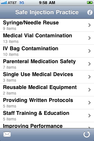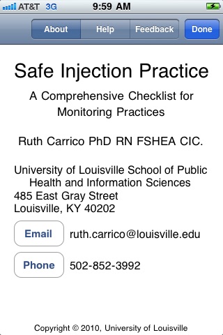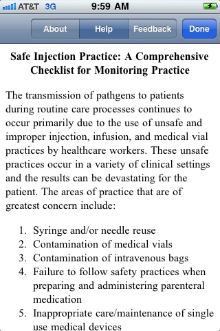 Assuring that safe injection practices are used is a critical component of safe patient care in all healthcare settings. This free application provides the opportunity for the users to monitor, assess, and catalogue current injection practices that are in place within a given healthcare facility. Data can be collected and a report emailed to individuals as a means of record-keeping. The application consists of an organized list of injection practices and evaluative items relevant to those practices. Each question should be able to be answered with a YES, NO or DO NOT KNOW response. If the injection practice is in alignment with safe practice, the answer to the question should be YES. If the response is NO, that should prompt immediate intervention. If the response is DO NOT KNOW, that should prompt an immediate investigation to ensure that safe injection practice is indeed in place. The goal of this first iteration of the application is to facilitate a monitoring process that can prevent patient harm. To utilize the application effectively, the individual assessing safe injection practice should have knowledge of the processes and be skilled in their evaluation. Comments and suggestions for application improvement are welcomed.