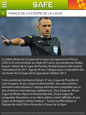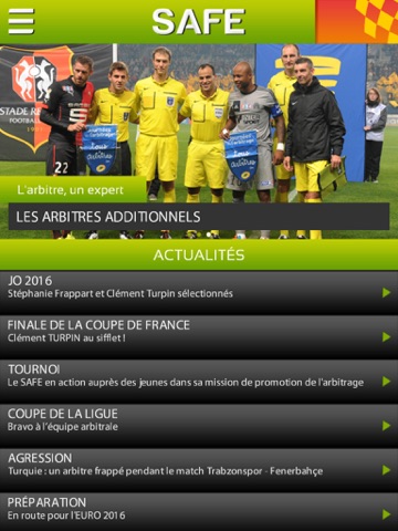 L’application du Syndicat des Arbitres du Football d’Elite (SAFE) est désormais disponible pour tous les passionnés d’arbitrage et de football. Découvrez et suivez l’actualité des arbitres de l’élite : désignations en France dans les championnats professionnels, désignations internationales, actualité des arbitres, compétitions, etc. A découvrir également : les communiqués de presse, les interviews, les dossiers (L’arbitre, un athlète, Techniques et technologies, L’Arbitre international, L’arbitre, un professionnel). L’application du SAFE est la référence de l’arbitrage d’élite français.